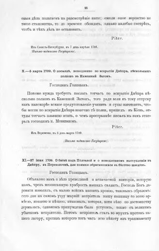 Письма и указы Императора Петра I к киевскому губернатору, князю Дмитрию Михайловичу Голицыну. О битве под Полтавой и о немедленном выступлении к Днепру, к Переволочне, для поимки обратившихся в бегство шведов. Из лагеря от Полтавы, в 27 день июня 1709