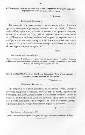 Письма и указы Императора Петра I к киевскому губернатору, князю Дмитрию Михайловичу Голицыну. О высылке из Киева, Чернигова, Стародуба и других городов пленных шведов в Серпухов. Из Митавы, в 8 день ноября 1709