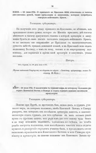 Письма и указы Императора Петра I к киевскому губернатору, князю Дмитрию Михайловичу Голицыну. О заключении с турками мира, по которому положено разорить Каменный Затон и Самару и отдать туркам каменно-затонскую артиллерию. Из лагару, в 15 день июля 1711, от реки Жижи