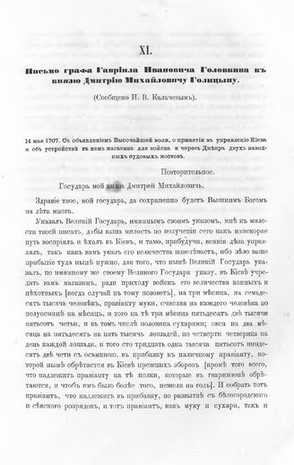 Письмо графа Гавриила Ивановича Головкина к князю Дмитрию Михайловичу Голицыну. С объявлением Высочайшей воли, о принятии в управление Киева и об устройстве в нем магазина для войска и через Днепр двух наводных судовых мостов. Из Люблина, мая в 14 день 1707 года