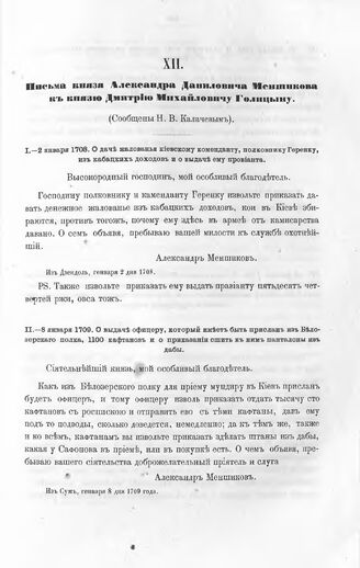 Письма князя Александра Даниловича Меншикова к князю Дмитрию Михайловичу Голицыну. О выдаче офицеру, который имеет быть прислан из Белозерского полка, 1100 кафтанов и о приказании сшить к ним панталоны из дабы. Из Сум, января 8 дня 1709 года