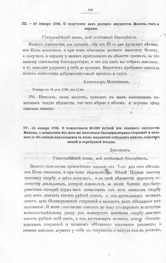 Письма князя Александра Даниловича Меншикова к князю Дмитрию Михайловичу Голицыну. О получении как росписи имущества Мазепы, так и скрыни. Января в 10 день 1709, из Сум
