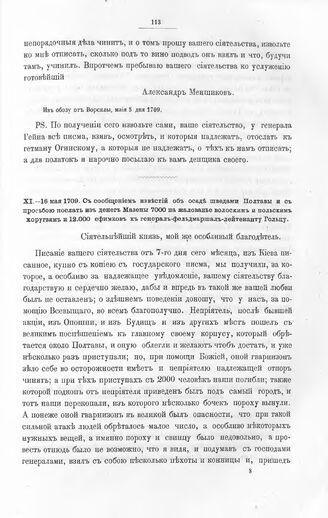 Письма князя Александра Даниловича Меншикова к князю Дмитрию Михайловичу Голицыну. С сообщением известий об осаде шведами Полтавы и с просьбою послать из денег Мазепы 7000 на жалованье волоским и польским хоругвям и 12.000 ефимков к генерал-фельдмаршал-лейтенанту Гольцу. Из обозу, мая 16 дня 1709 году