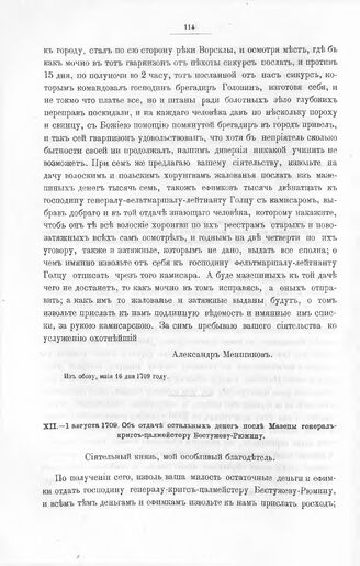 Письма князя Александра Даниловича Меншикова к князю Дмитрию Михайловичу Голицыну. Об отдаче остальных денег после Мазепы генѳрал- кригс-цалмѳйстеру Бестужеву-Рюмину. Из Веты, августа 1-го дня 1709 году