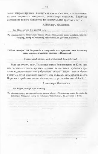 Письма князя Александра Даниловича Меншикова к князю Дмитрию Михайловичу Голицыну. О принятии и содержании под арестом князя Вишневецкого, которого привезет адъютант Полянской. Из Торуня, октября 6 дня 1709 году