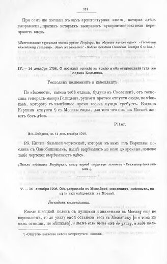 Указы и письма Императора Петра I к московскому коменданту, а потом сибирскому губернатору, князю Матвею Петровичу Гагарину. О посылке оружия в армию и об отправлении туда же Богдана Кельхина. Из Лебедина, в 14 день декабря 1708