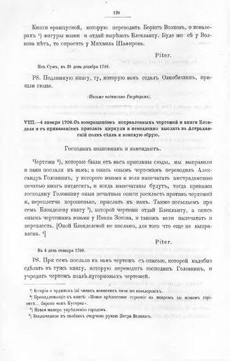 Указы и письма Императора Петра I к московскому коменданту, а потом сибирскому губернатору, князю Матвею Петровичу Гагарину. С возвращением исправленных чертежей и книги Блондѳля и с приказанием прислать циркули и немедленно выслать в Астраханский...
