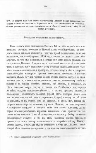 Указы и письма Императора Петра I к московскому коменданту, а потом сибирскому губернатору, князю Матвею Петровичу Гагарину. Об отдаче англичанину Вилиму Лейду стеклянных заводов в Москве, близ села Воробьева, на 10 лет безоброчно, с обязательство...