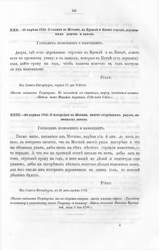 Указы и письма Императора Петра I к московскому коменданту, а потом сибирскому губернатору, князю Матвею Петровичу Гагарину. О сломке в Москве, в Кремле и Китае городе, деревянных домов и лавок. Из Санкт-Питербурха, апреля 15 дня 1710-го
