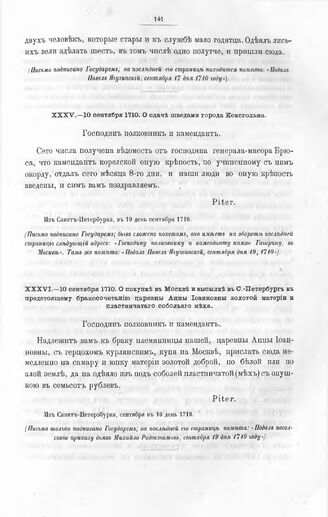 Указы и письма Императора Петра I к московскому коменданту, а потом сибирскому губернатору, князю Матвею Петровичу Гагарину. О покупке в Москве и высылке в С.-Петербург к предстоящему бракосочетанию царевны Анны Иоанновны золотой материи и пластинчатого собольего меха. Из Санкт-Петерзбурка, сентября в 10 день 1710