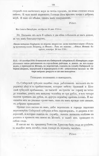 Указы и письма Императора Петра I к московскому коменданту, а потом сибирскому губернатору, князю Матвею Петровичу Гагарину. О высылке из Сибирской губернии в С.-Петербург определенного числа работников к городовым работам и денег на их содержание...