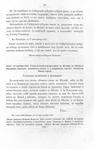 Указы и письма Императора Петра I к московскому коменданту, а потом сибирскому губернатору, князю Матвею Петровичу Гагарину. О недозволении строить вновь в Москве, в Белом и Земляном городах, каменных домов и о разрешении строить таковые в Китае городе. Из Санкт-Питербурха, в 17 день октября 1710