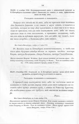 Указы и письма Императора Петра I к московскому коменданту, а потом сибирскому губернатору, князю Матвею Петровичу Гагарину. О высылке в С.-Петербург прежде срока пятой части провианта, который следует поставить по наряду. Из Санкт-Питербурха, в 8 день ноября 1710