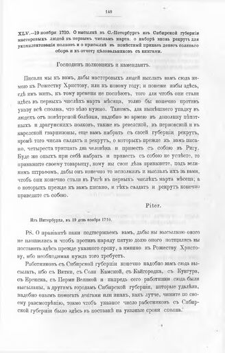 Указы и письма Императора Петра I к московскому коменданту, а потом сибирскому губернатору, князю Матвею Петровичу Гагарину. О высылке в С.-Петербург из Сибирской губернии мастеровых людей к первым числам марта; о наборе вновь рекрут для укомплектования полков и о присылке в поместный приказ денег соляного сбора и к отчету целовальников с книгами. Из Питербурха, в 19 день ноября 1710