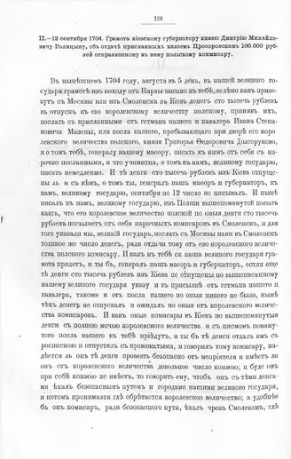 Указы, повеления и письма Императора Петра I разным лицам. Грамота киевскому губернатору князю Дмитрию Михайловичу Голицыну, об отдаче присланных князем Прозоровским 100.000 рублей отправленному к нему польскому коммисару. Писан в Нарве, лета 1704 сентября в 12 день // Из архива правительствующего сената.