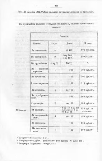 Указы, повеления и письма Императора Петра I разным лицам. Табель окладов служилым людям в приказах. 31 октября 1704 // Из архива правительствующего сената.