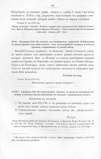 Указы, повеления и письма Императора Петра I разным лицам. Об изготовлении таблицы по разным денежным выдачам и таблицы сколько находится по городам гарнизонных полков. Преображенское, 1 февраля 1710 // Из архива правительствующего сената.