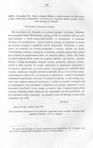 Указы, повеления и письма Императора Петра I разным лицам. Указ генералу Вейде, о сборе полков к 10-му мая и о том, чтобы они, отправляясь в поход, не оставляли нигде людей, полковых обозов и лошадей. Дан в Луцку, апреля 13 дня 1711 // Из архива правительствующего сената.