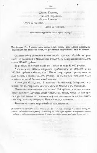 Высочайшие указы и повеления Императора Петра I, данные правительствующему сенату. О передаче на рассмотрение сената ходатайства дьяков, находящихся при соляном сборе, об увеличении получаемого ими жалованья. 5 марта 1711 // Из архива правительствующего сената.