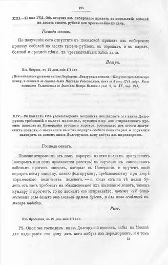 Высочайшие указы и повеления Императора Петра I, данные правительствующему сенату. Об удовлетворении могущих последовать от князя Долгорукова требований о выдаче жалованья, мундира и пр. для отправленного против шведов в Померанию русского корпуса, состоящего из шести драгунских полков, о назначении в этот корпус особого коммисара и о поручении надзирать за домом князя Долгорукова кому нибудь из царедворцев. Из Ярославля, в 29 день мая 1711-го // Из архива правительствующего сената. Голиков И. Деяния Петра Великого (изд. 2, т. XV, стр. 214).