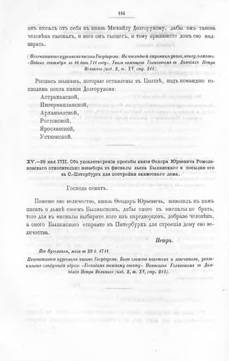 Высочайшие указы и повеления Императора Петра I, данные правительствующему сенату. Сб удовлетворении просьбы князя Федора Юрьевича Ромодановского относительно нѳвыбора в фискалы дьяка Былинского и посылки его в С.-Петербург для постройки княжеского дома. Из Ярославля, мая в 29 д. 1711