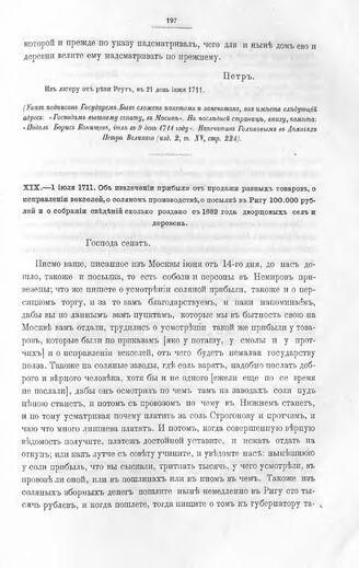 Высочайшие указы и повеления Императора Петра I, данные правительствующему сенату. Об извлечении прибыли от продажи разных товаров, о исправлении векселей, о соляном производстве, о посылке в Ригу 100.000 рублей и о собрании сведений сколько роздано с 1682 года дворцовых сел и деревень. От реки Прута, в 1 день июля 1711-го // Из архива правительствующего сената. Голиков И. Деяния Петра Великого (изд. 2, т. XV, стр. 227—228).