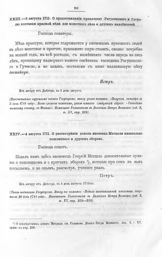 Высочайшие указы и повеления Императора Петра I, данные правительствующему сенату. О предоставлении приказчику Рагузинского и Гутфелю поставки красной меди для монетного дела и других надобностей. Из лагару от Днестра, в 3 день августа 1711