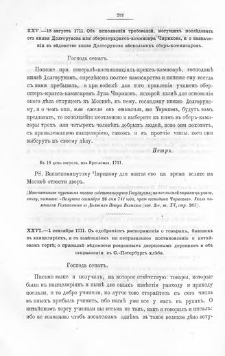 Высочайшие указы и повеления Императора Петра I, данные правительствующему сенату. С одобрением распоряжения о товарах, бывших в канцеляриях, и с замечанием на неправильное постановление о китайском торге; о присылке ведомости розданным дворцовым деревням и об отправлении в С.-Петербург хлеба. Из Торруня, в 1 д. сентября 1711 // Из архива правительствующего сената. Голиков И. Деяния Петра Великого (изд. 2, т. XV, стр. 265—267).