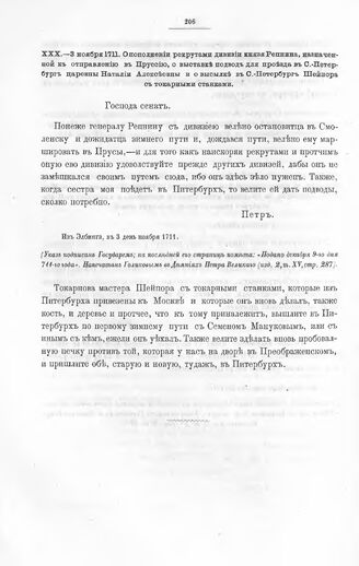 Высочайшие указы и повеления Императора Петра I, данные правительствующему сенату. О пополнении рекрутами дивизии князя Репнина, назначенной к отправлению в Пруссию, о выставке подвод для проезда в С.-Петербург царевны Наталии Алексеевны и о высылке в С.-Петербург Шѳйпора с токарными станками. Из Элбинга, в 3 день ноября 1711