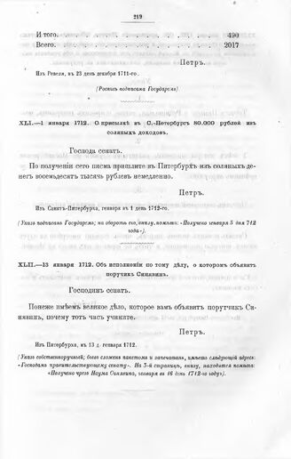 Высочайшие указы и повеления Императора Петра I, данные правительствующему сенату. Об исполнении по тому делу, о котором объявит поручик Синявин. Из Питербурха, в 13 д. января 1712 // Из архива правительствующего сената.