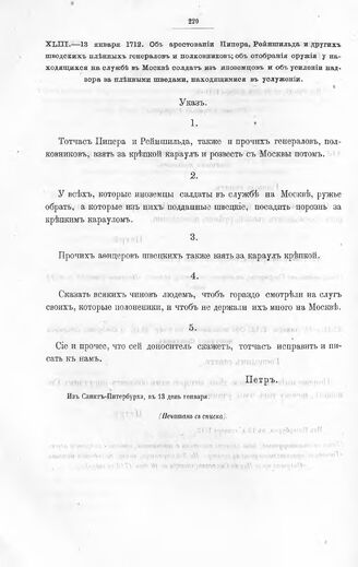 Высочайшие указы и повеления Императора Петра I, данные правительствующему сенату. Об арестовании Пипера, Рейншильда и других шведских пленных генералов и полковников; об отобрания оружия у находящихся на службе в Москве солдат из иноземцев и об усилении надзора за пленными шведами, находящимися в услужении. Из Санкт-Питербурха, в 13 день января 1712