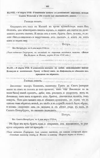 Высочайшие указы и повеления Императора Петра I, данные правительствующему сенату. О дозволении взятым в плен лифляндцам: майору Кошкулю и капитанам Грану и Скогу жить в Лифляндии, по обязании их присягой на верность. Из Санкт-Питербурха, в 6 день марта 1712-го // Из архива правительствующего сената.