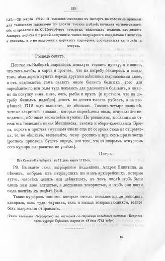 Высочайшие указы и повеления Императора Петра I, данные правительствующему сенату. О высылке ежегодно в Выборг на съестные припасы для тамошнего гарнизона по десяти тысяч рублей, начиная с настоящего; об отправлении в С.-Петербург четырех пехотных полков из дивизии Алларта, пороха и прочей аммуниции, также патриаршего поддиакона Никитина и певчих, и о не задержании царских курьеров, посылаемых к армии и оттуда. Из Санкт-Питербурха, в 12 день марта 1712-го // Из архива правительствующего сената.