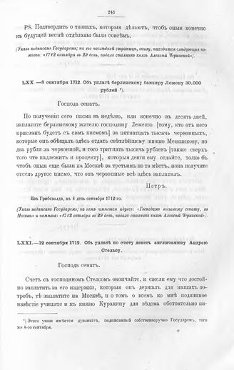 Высочайшие указы и повеления Императора Петра I, данные правительствующему сенату. Об уплате берлинскому банкиру Лежену 30.000 рублей. Из Грибсвалда, в 8 день сентября 1712-го // Из архива правительствующего сената.