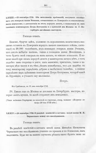 Высочайшие указы и повеления Императора Петра I, данные правительствующему сенату. О разделе поместий и вотчин после князя М.Я. Черкасского между его наследниками. Из Грибсвалда, в 19 день сентября 1712 // Из архива правительствующего сената.