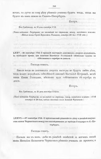 Высочайшие указы и повеления Императора Петра I, данные правительствующему сенату. О приостановке решения по делу о разделе имущества князя Черкасского между его наследниками до приезда Государя в С.-Петербург. Дано в Грибсвалде, в 27 день сентября 1712 // Из архива правительствующего сената.
