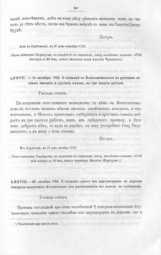 Высочайшие указы и повеления Императора Петра I, данные правительствующему сенату. О посылке в Константинополь к русским послам лисьих и других мехов, на три тысячи рублей. Из Карлсбада, в 13 день октября 1712 // Из архива правительствующего сената.