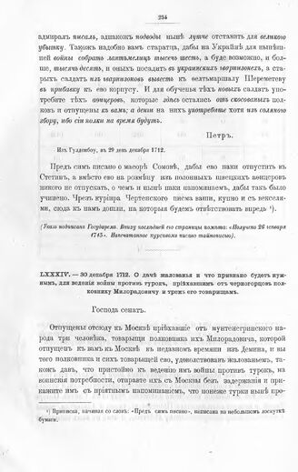Высочайшие указы и повеления Императора Петра I, данные правительствующему сенату. О даче жалованья и что признано будет нужным, для ведения войны против турок, приехавшим от черногорцев полковнику Милорадовичу и трем его товарищам. Из Голденбоу, декабря 30 дня 1712 // Из архива правительствующего сената.
