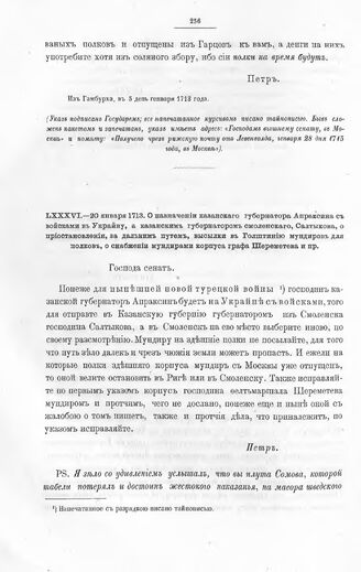 Высочайшие указы и повеления Императора Петра I, данные правительствующему сенату. О назначении казанского губернатора Апраксина с войсками в Украйну, а казанским губернатором смоленского, Салтыкова, о приостановлении, за дальним путем, высылки в Голштинию мундиров для полков, о снабжении мундирами корпуса графа Шереметева и пр. Из Голстиндии от крепости Ренцбурха, в 20 день января 1713 года // Из архива правительствующего сената.