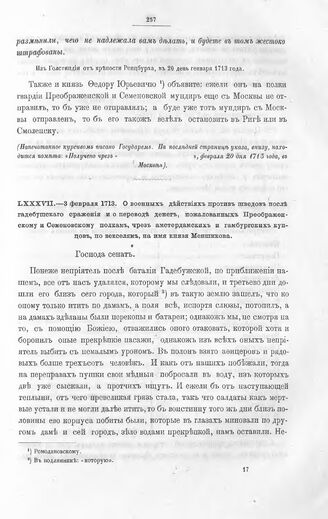Высочайшие указы и повеления Императора Петра I, данные правительствующему сенату. О военных действиях против шведов после гадебушского сражения и о переводе денег, пожалованных Преображенскому и Семеновскому полкам, чрез амстердамских и гамбургских купцов, по векселям, на имя князя Меншикова. Из Фридрихштада, в 3 день февраля 1713-го // Из архива правительствующего сената.