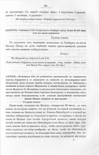 Высочайшие указы и повеления Императора Петра I, данные правительствующему сенату. С одобрением распоряжений по украинскому корпусу Апраксина и с выговором за отделение к фельдмаршалу графу Шереметеву двух полков дивизии Алларта, необходимых в Финляндии; о снабжении полков корпуса Шереметева и дивизии Вейда мундирами; о прибытии из Москвы в С.-Петербург с ведомостями: нескольким сенаторам, возвратившемуся из Польши князю Григорию Долгорукову и московскому губернатору князю Ромодановскому, и об учинении распоряжений относительно имения Шеина, умершего в Амстердаме. Из Шейнгоузена, в 28 день Февраля 1713 года // Из архива правительствующего сената.
