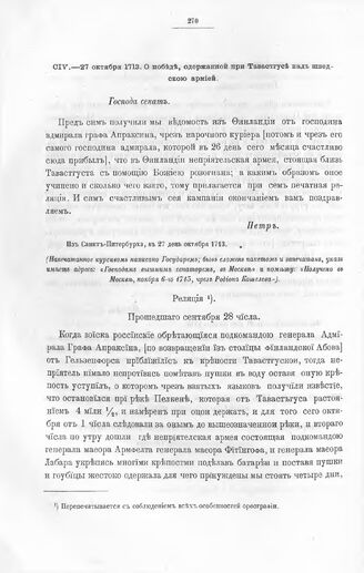 Высочайшие указы и повеления Императора Петра I, данные правительствующему сенату. О победе, одержанной при Тавастгусе над шведской армией. Из Санкт-Питербурха, в 27 день октября 1713
