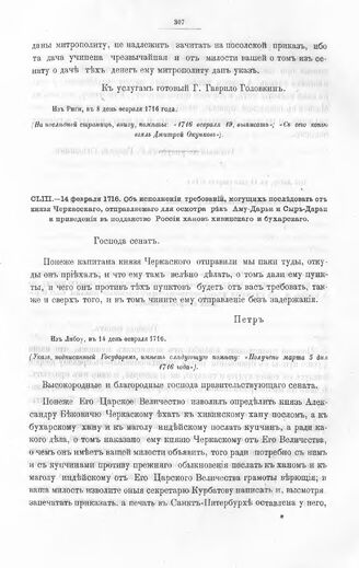 Высочайшие указы и повеления Императора Петра I, данные правительствующему сенату. Об исполнении требований, могущих последовать от князя Черкасского, отправляемого для осмотра рек Аму-Дарьи и Сыр-Дарьи и приведения в подданство России ханов хивинского и бухарского. Из Либоу, в 14 день февраля 1716 // Из архива правительствующего сената.