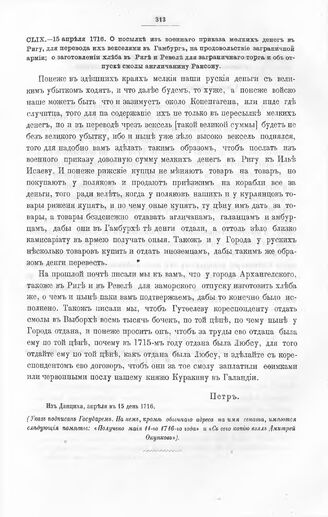 Высочайшие указы и повеления Императора Петра I, данные правительствующему сенату. О посылке из военного приказа мелких денег в Ригу, для перевода их векселями в Гамбург, на продовольствие заграничной армии; о заготовлении хлеба в Риге и Ревеле дл...