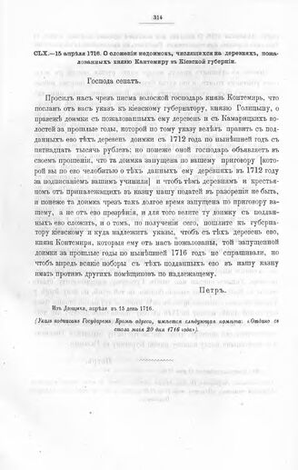 Высочайшие указы и повеления Императора Петра I, данные правительствующему сенату. О сложении недоимок, числящихся на деревнях, пожалованных князю Кантемиру в Киевской губернии. Из Данциха, апреля в 15 день 1716 // Из архива правительствующего сената.