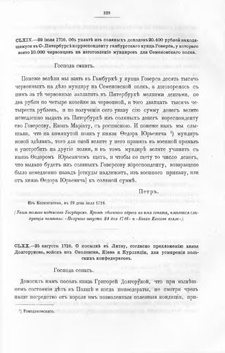 Высочайшие указы и повеления Императора Петра I, данные правительствующему сенату. О посылке в Литву, согласно предложению князя Долгорукова, войск из Смоленска, Киева и Курляндии, для усмирения польских конфедератов. Из Копенгагена, августа в 25 день 1716 // Из архива правительствующего сената.