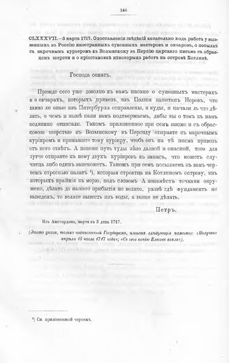Высочайшие указы и повеления Императора Петра I, данные правительствующему сенату. О доставлении сведений касательно хода работ у вызванных в Россию иностранных суконных мастеров и овчаров, о посылке с нарочным курьером к Волынскому в Персию царского письма с образцом шерсти и о приостановке некоторых работ на острове Котлине. Из Амстердама, марта в 3 день 1717 // Из архива правительствующего сената.