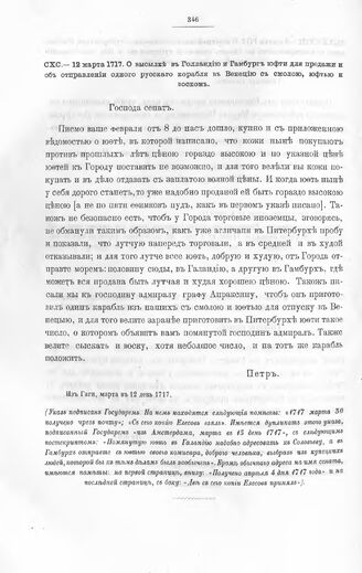 Высочайшие указы и повеления Императора Петра I, данные правительствующему сенату. О высылке в Голландию и Гамбург юфти для продажи и об отправлении одного русского корабля в Венецию с смолой, юфтью и воском. Из Гаги, марта в 12 день 1717