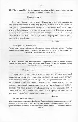 Высочайшие указы и повеления Императора Петра I, данные правительствующему сенату. О немедленном отпуске на работы в адмиралтейство денег из тех сумм, которые прежде ассигнованы были на русские войска, находящиеся в Мекленбурге. Из Шпа, в 20 день июня 1717 // Из архива правительствующего сената.