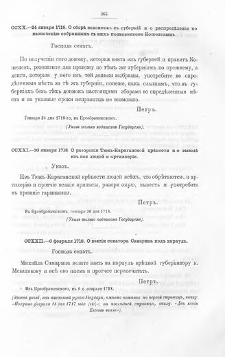 Высочайшие указы и повеления Императора Петра I, данные правительствующему сенату. О взятии сенатора Самарина под караул. Из Преображенского, в 6 д. февраля 1718 // Из архива правительствующего сената.